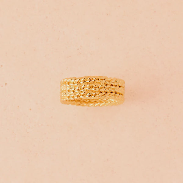 A wide band ring with a textured, asymmetrical braid design — reminiscent of twisted rope, hand-woven straw, or sun-dried wicker.