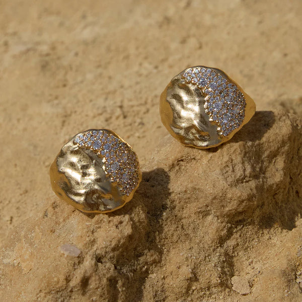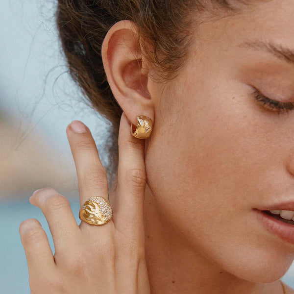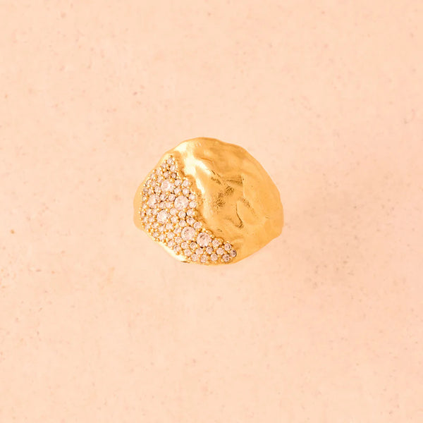 A large round ring that wraps around the finger, its textured gold melting like a wave over irregularly scattered white stones.